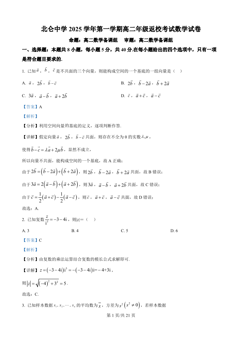 高二数学(精品解析版)--浙江省宁波市北仑中学2025-2026学年高二上学期返校考试