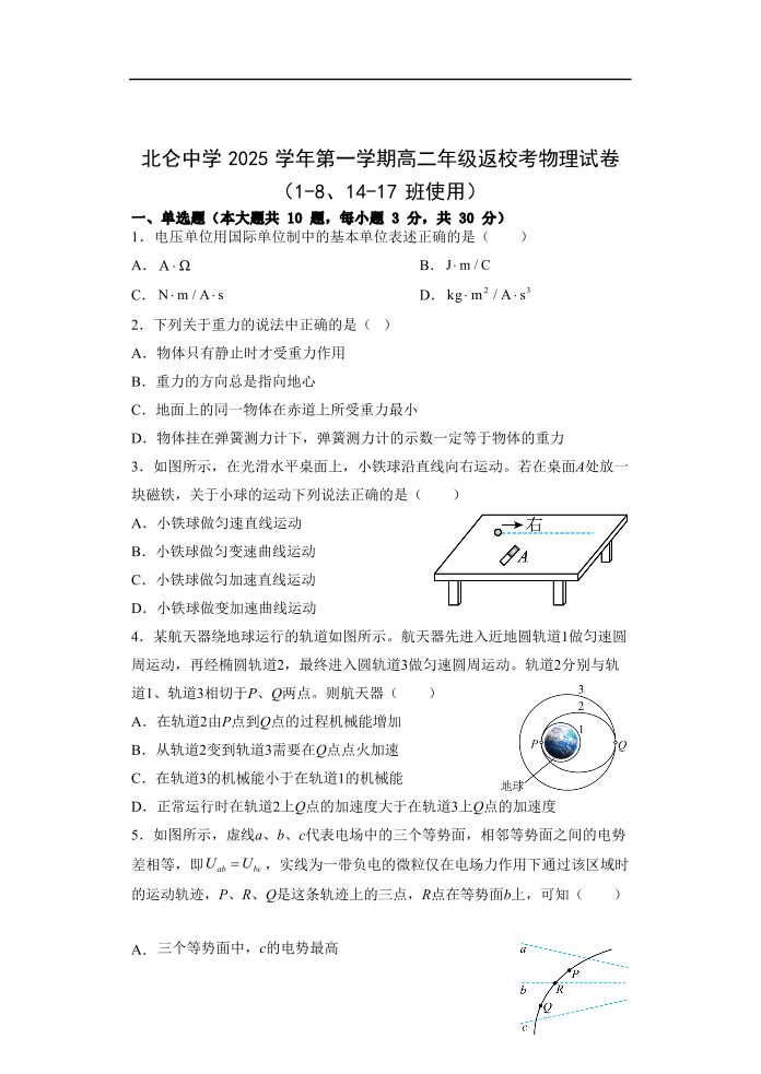 高二物理--浙江省宁波市北仑中学2025-2026学年高二上学期返校考试