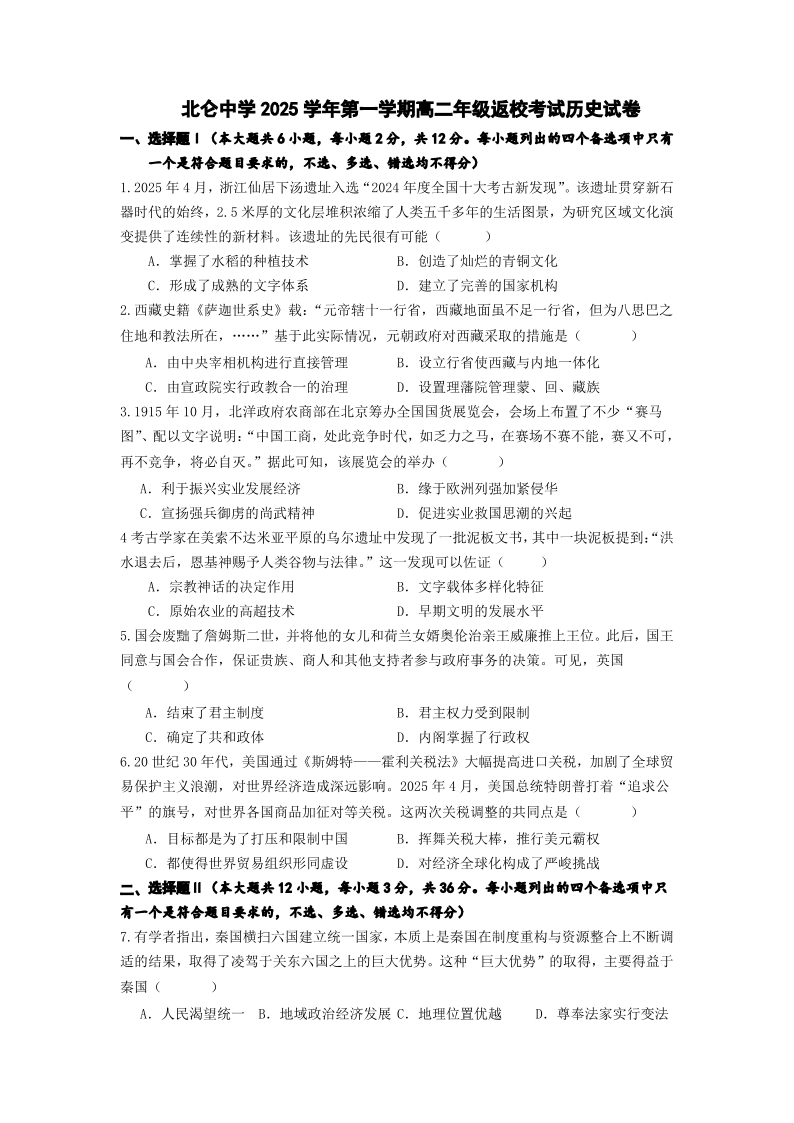高二历史--浙江省宁波市北仑中学2025-2026学年高二上学期返校考试