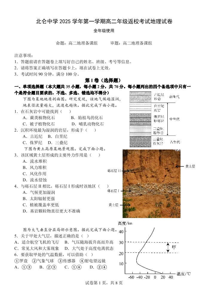 高二地理--浙江省宁波市北仑中学2025-2026学年高二上学期返校考试