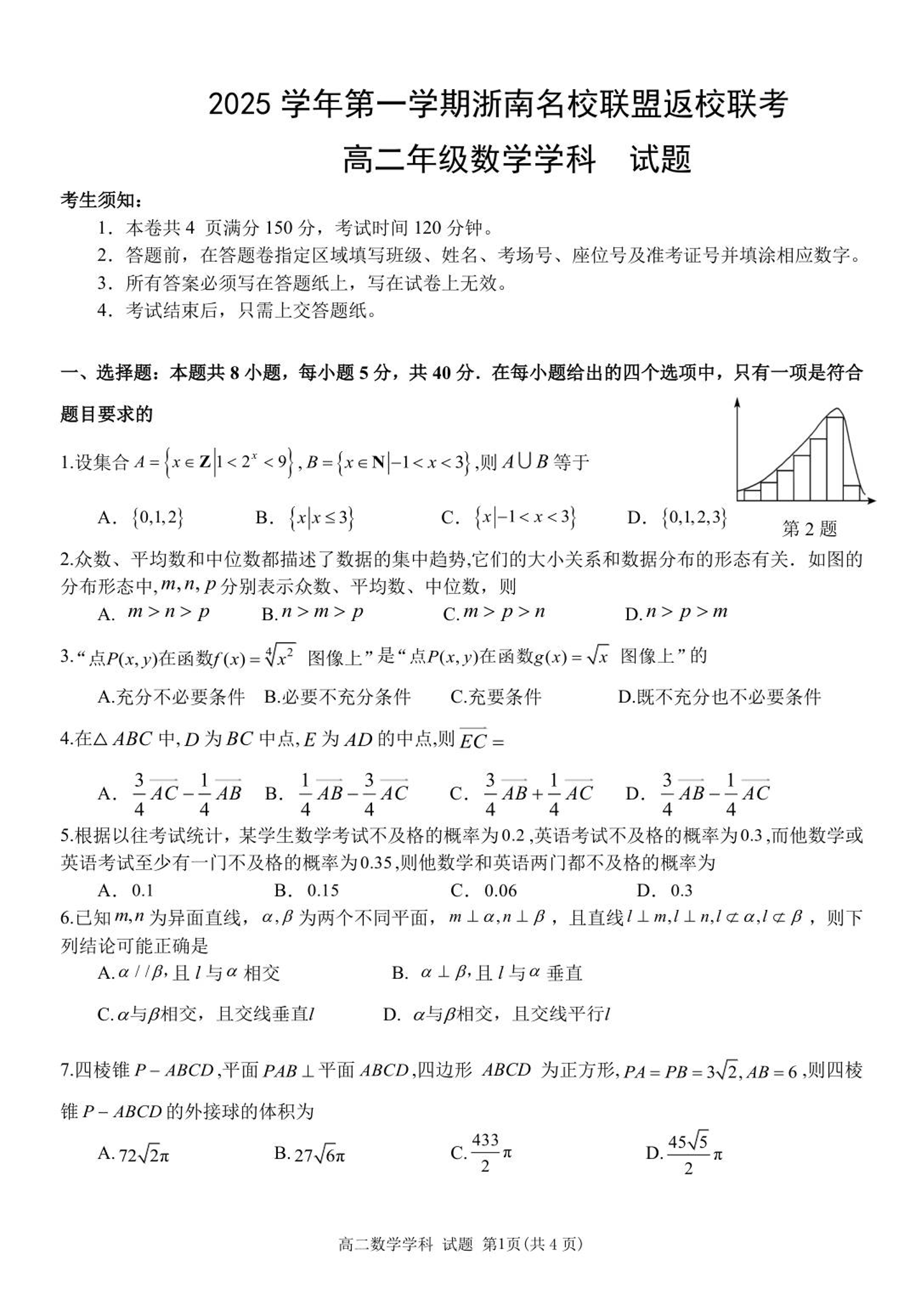 高二数学--浙江省浙南名校联盟2025-2026学年高二上学期返校联考