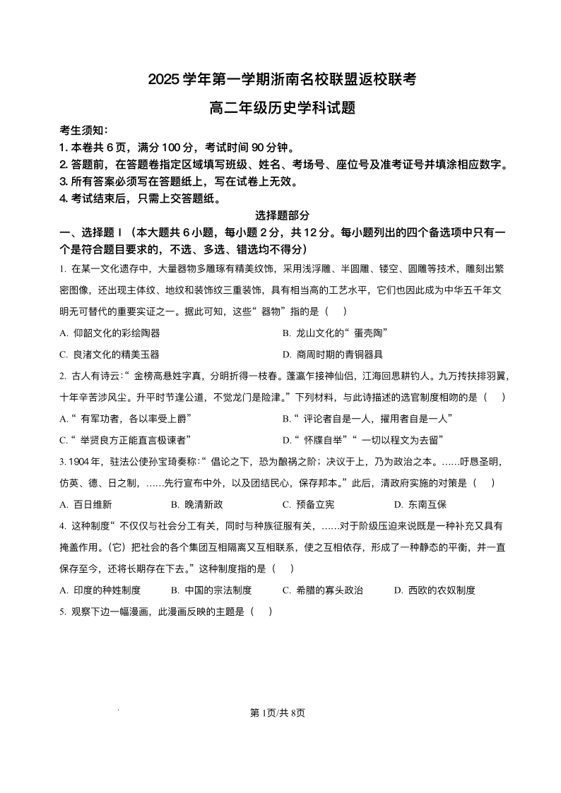 高二历史+答案--浙江省浙南名校联盟2025-2026学年高二上学期返校联考