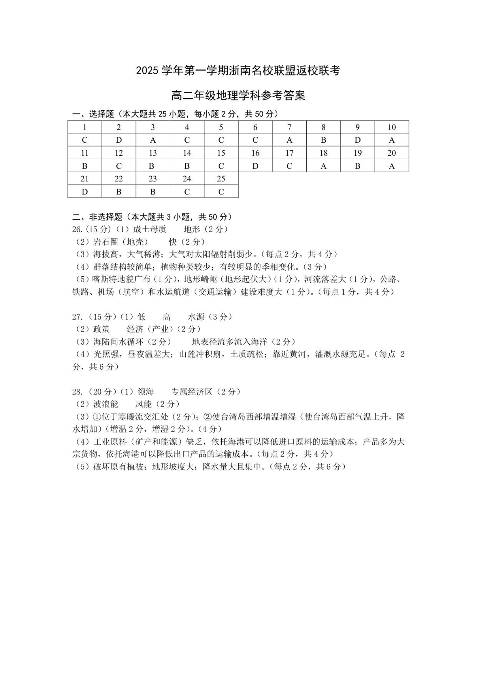 高二地理答案--浙江省浙南名校联盟2025-2026学年高二上学期返校联考