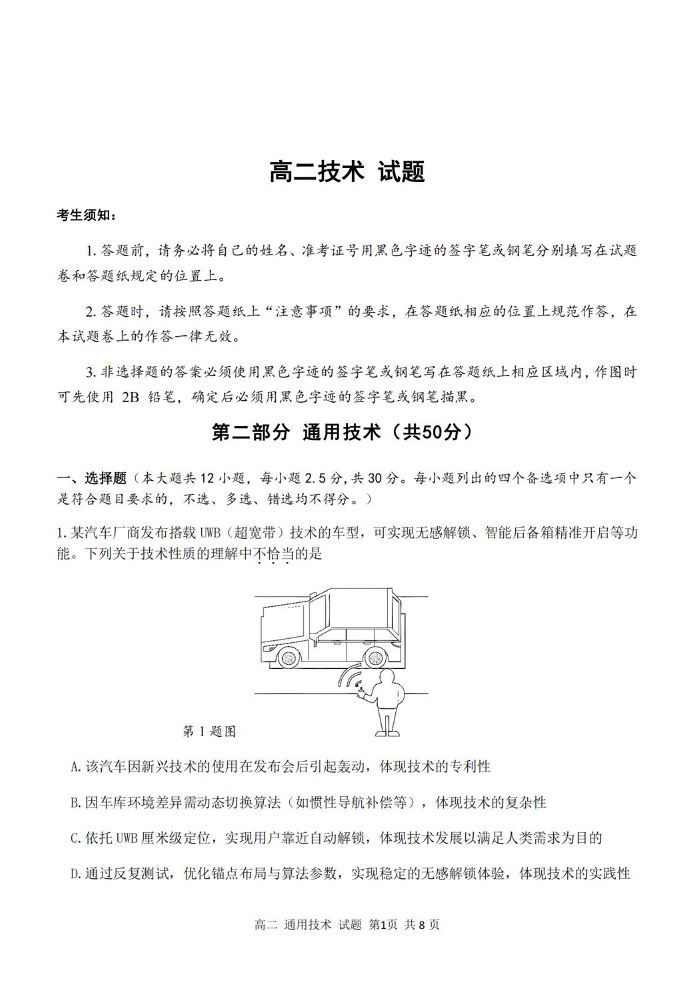 高二通用技术+答案--浙江省浙南名校联盟2025-2026学年高二上学期返校联考