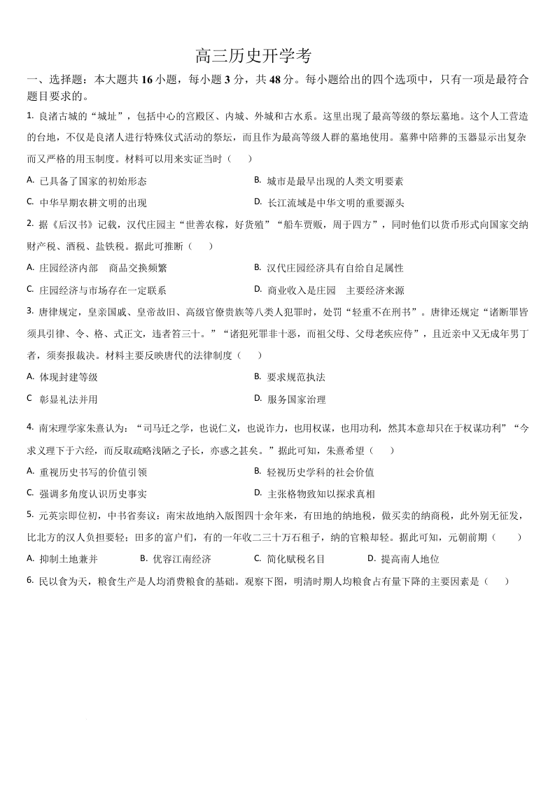 高三历史+答案--吉林省通化市梅河口市第五中学2026届高三上学期9月开学考试