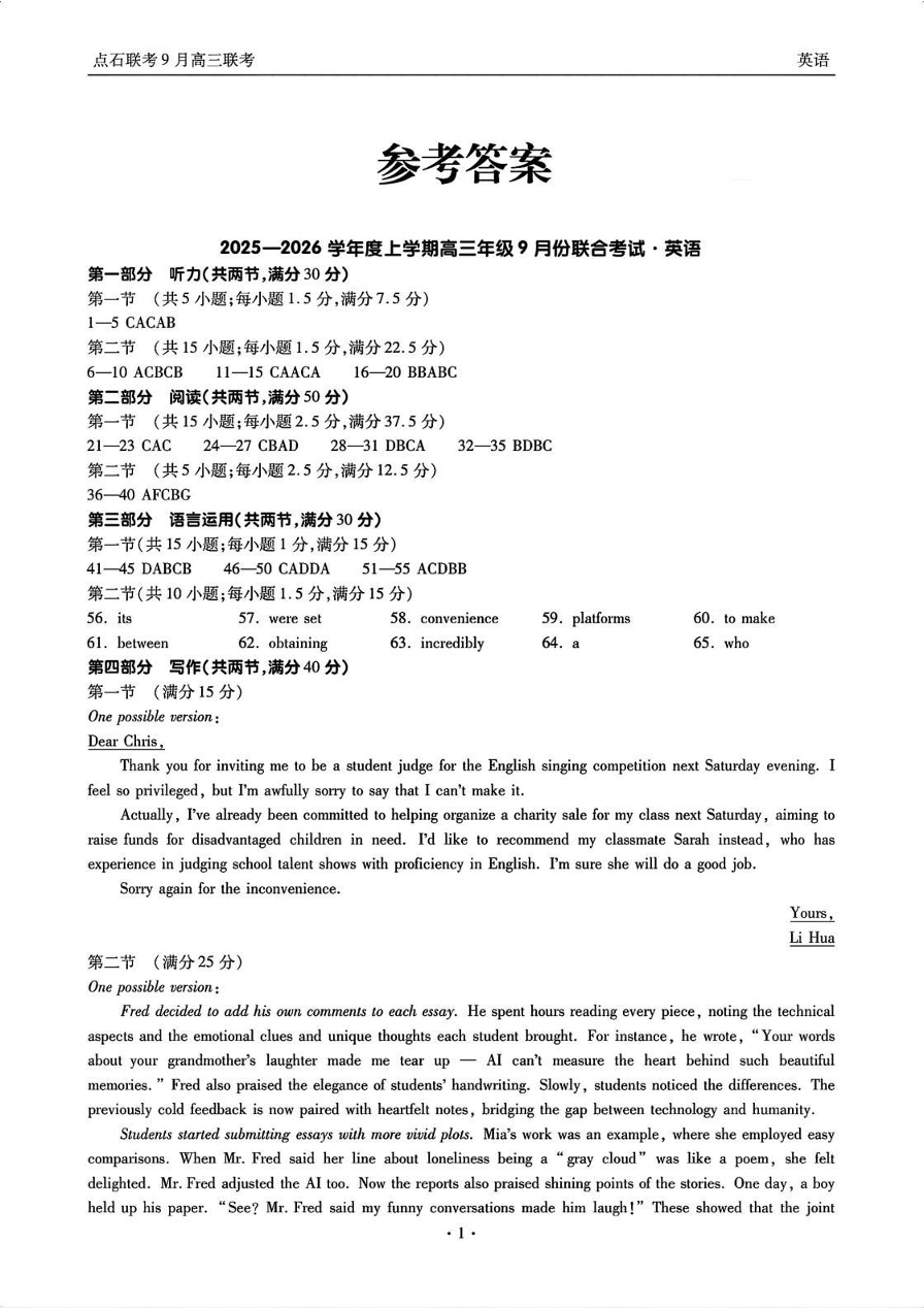 高三英语答案--辽宁省点石联考2026届高三9月份联合考试