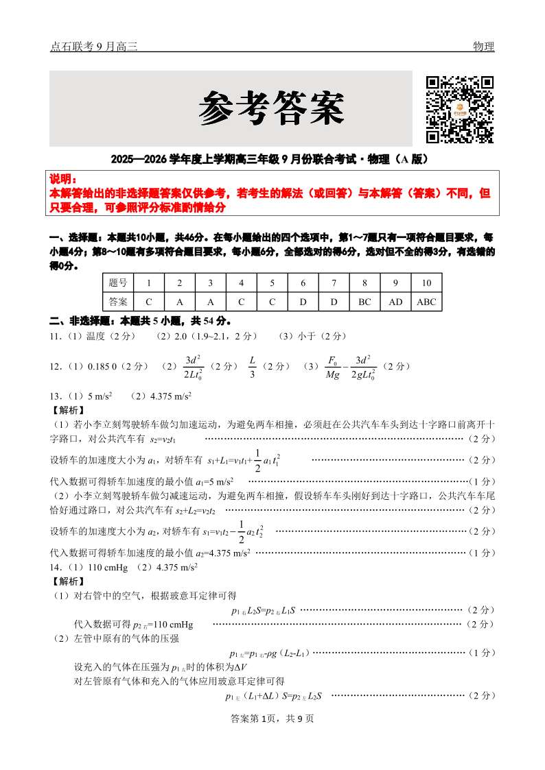 高三物理答案A版--辽宁省点石联考2026届高三9月份联合考试