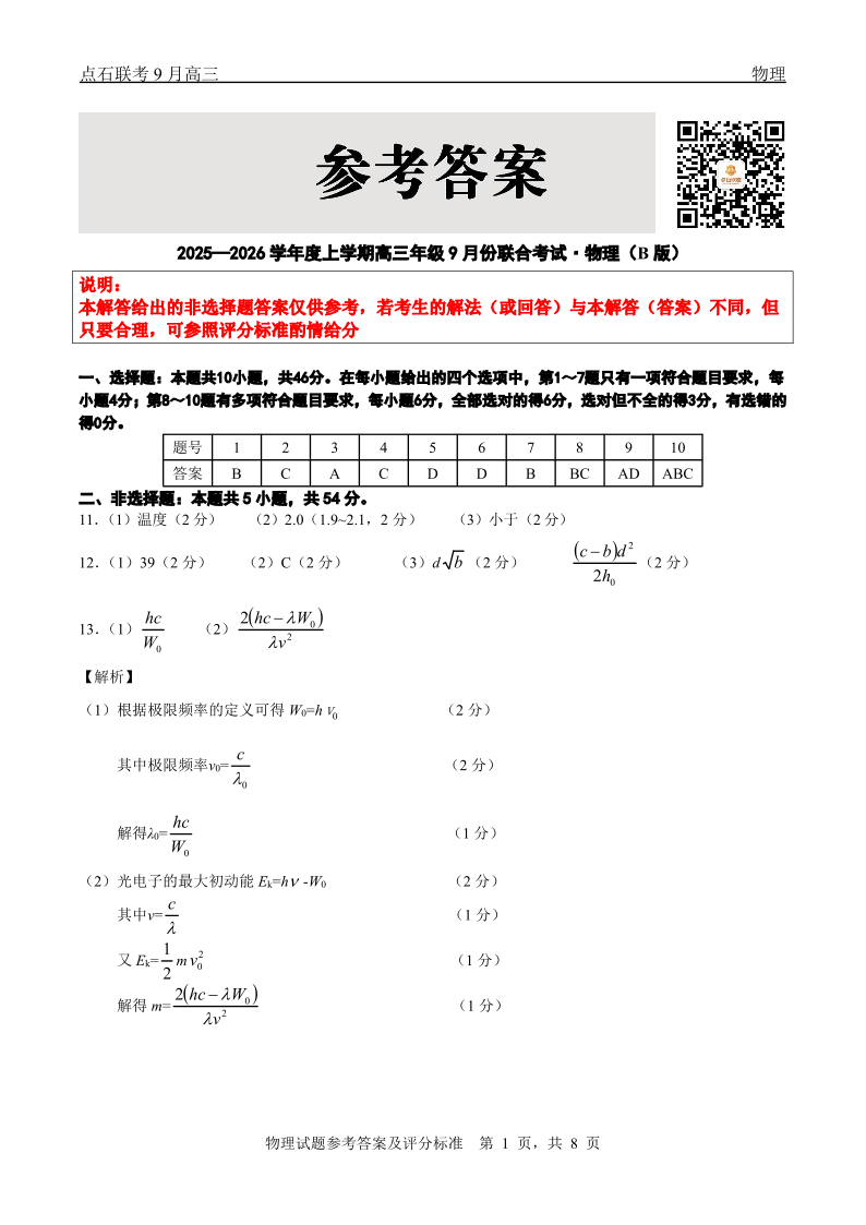 高三物理答案B版--辽宁省点石联考2026届高三9月份联合考试