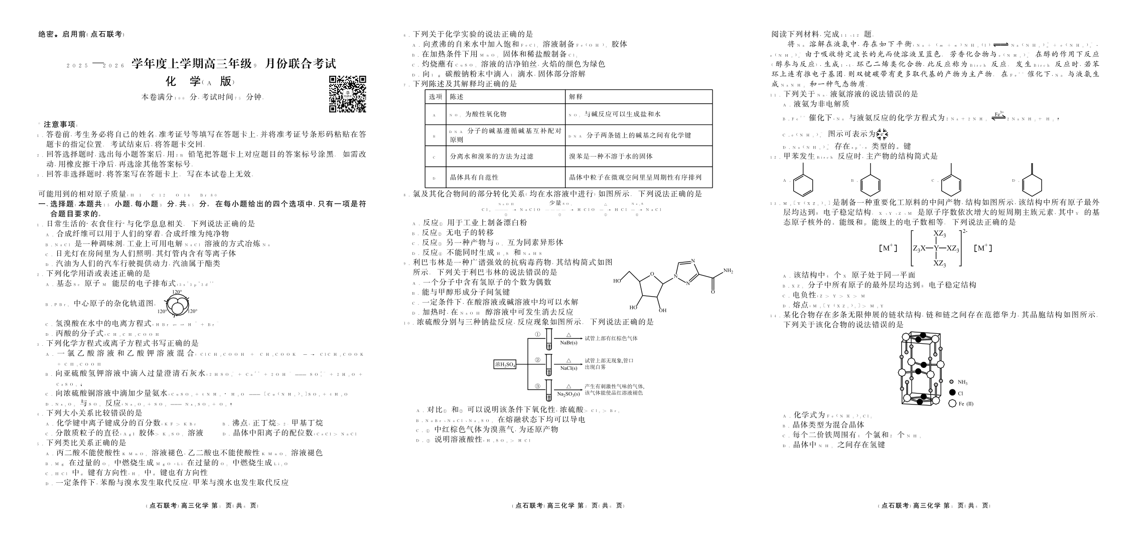 高三化学A版--辽宁省点石联考2026届高三9月份联合考试