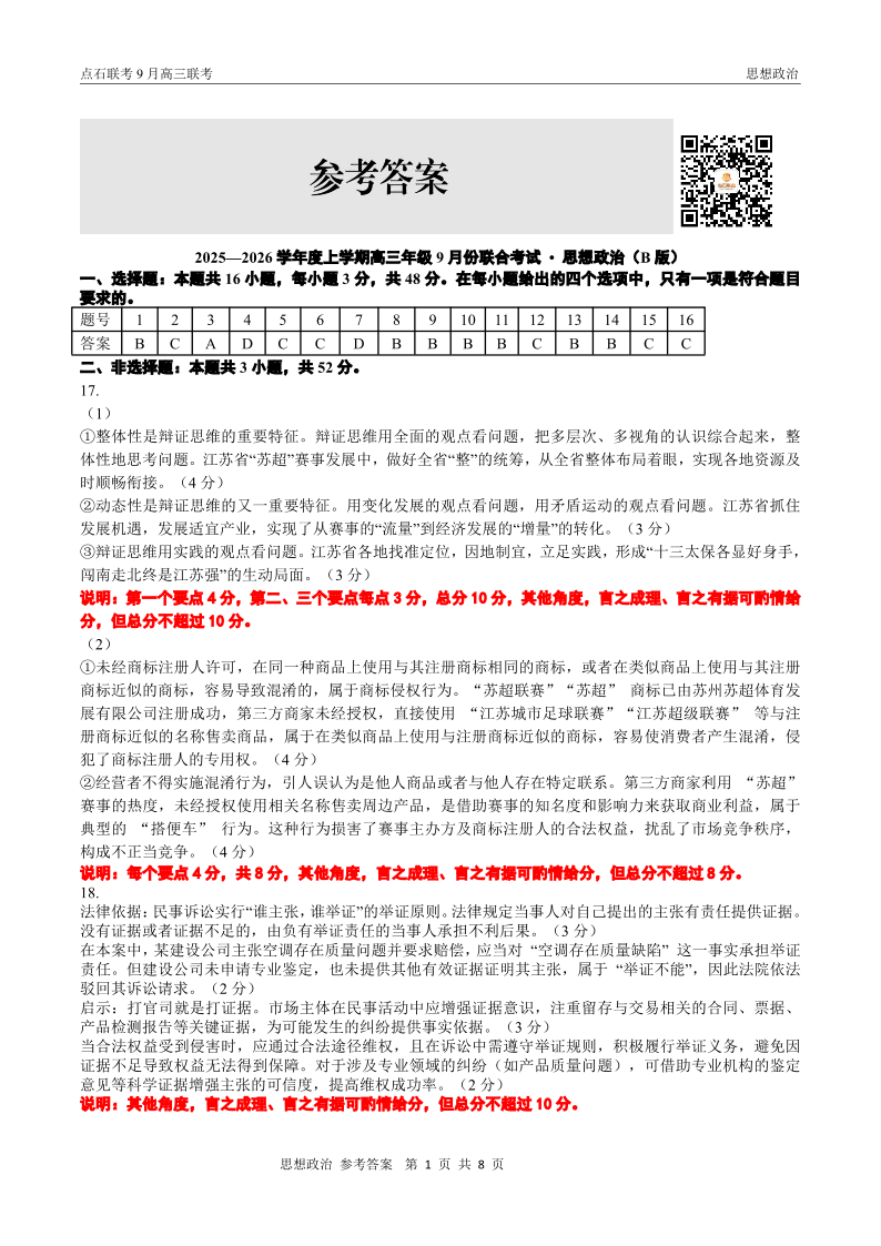 高三政治B版答案--辽宁省点石联考2026届高三9月份联合考试
