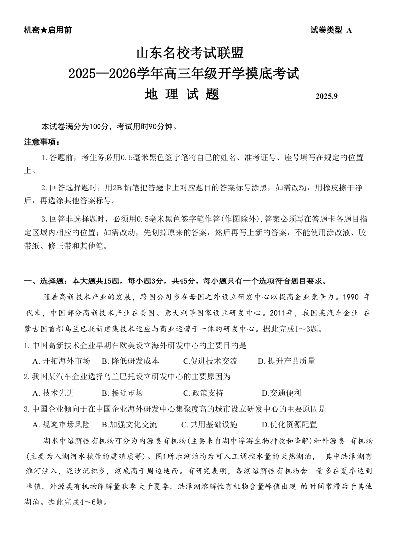高三地理+答案--山东省名校考试联盟2026届高三上学期9月开学摸底考试