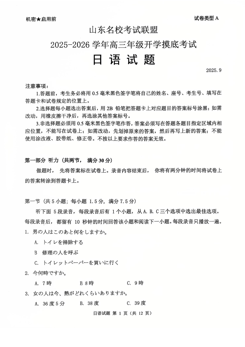 高三日语--山东省名校考试联盟2026届高三上学期9月开学摸底考试