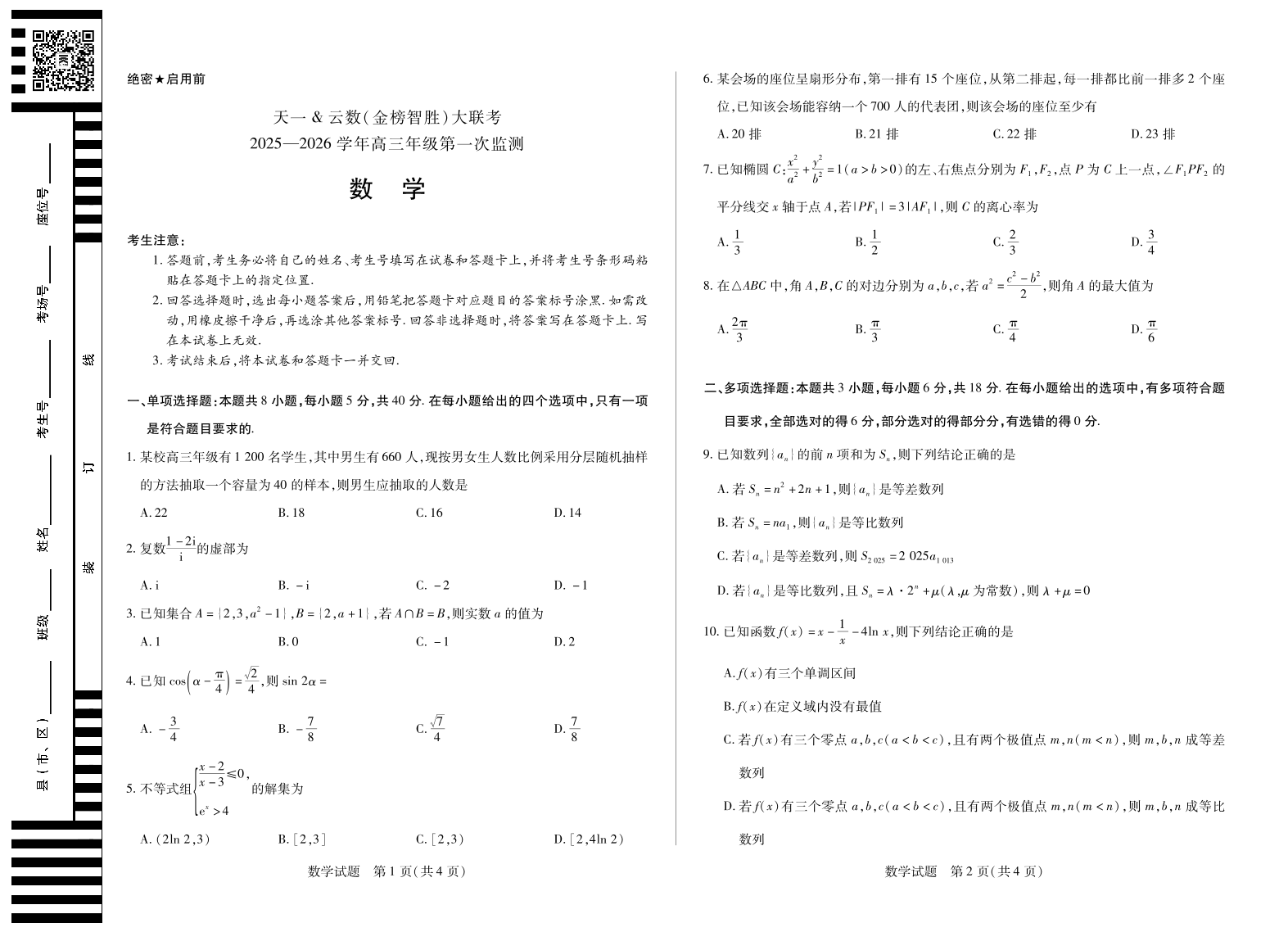 高三数学--四川省天一云数(金榜智胜)大联考2026届高三年级第一次监测