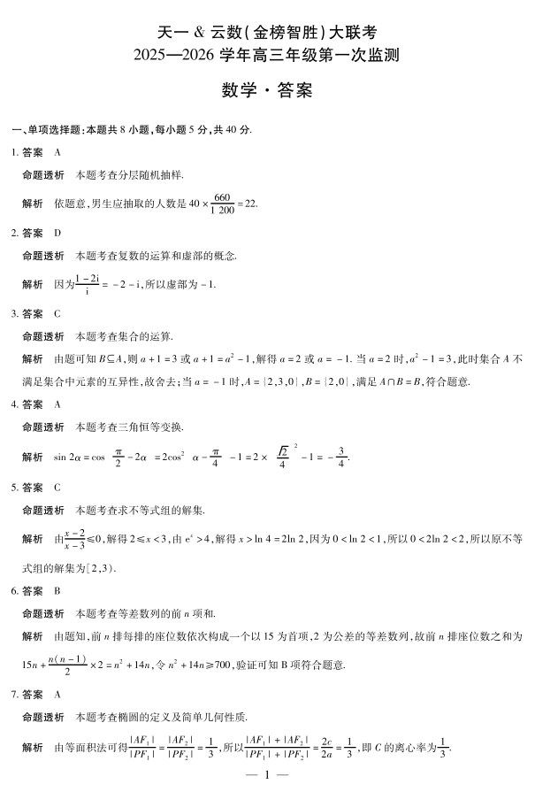 高三数学答案--四川省天一云数(金榜智胜)大联考2026届高三年级第一次监测