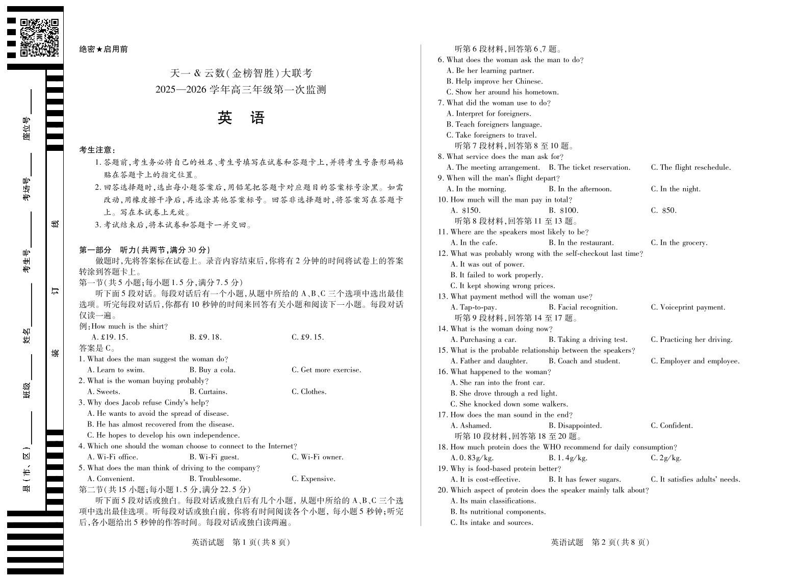 高三英语--四川省天一云数(金榜智胜)大联考2026届高三年级第一次监测