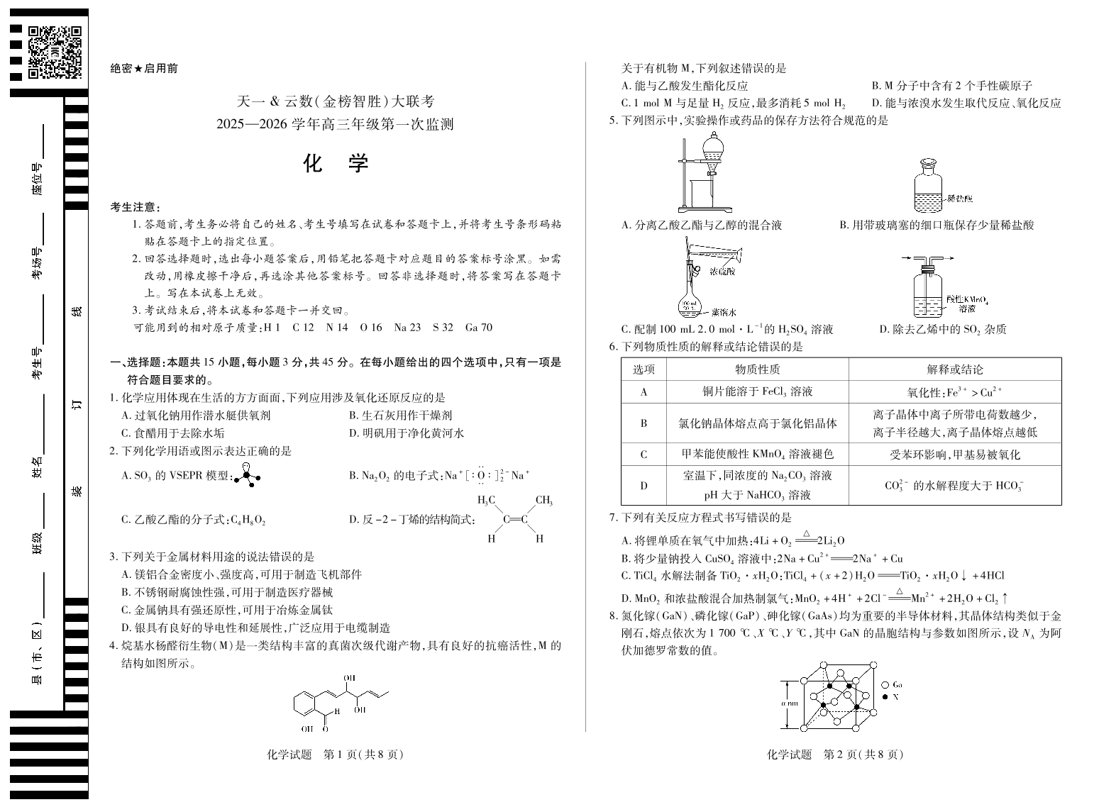 高三化学--四川省天一云数(金榜智胜)大联考2026届高三年级第一次监测