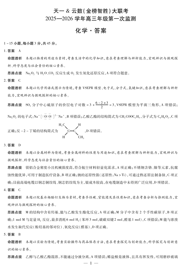 高三化学答案--四川省天一云数(金榜智胜)大联考2026届高三年级第一次监测