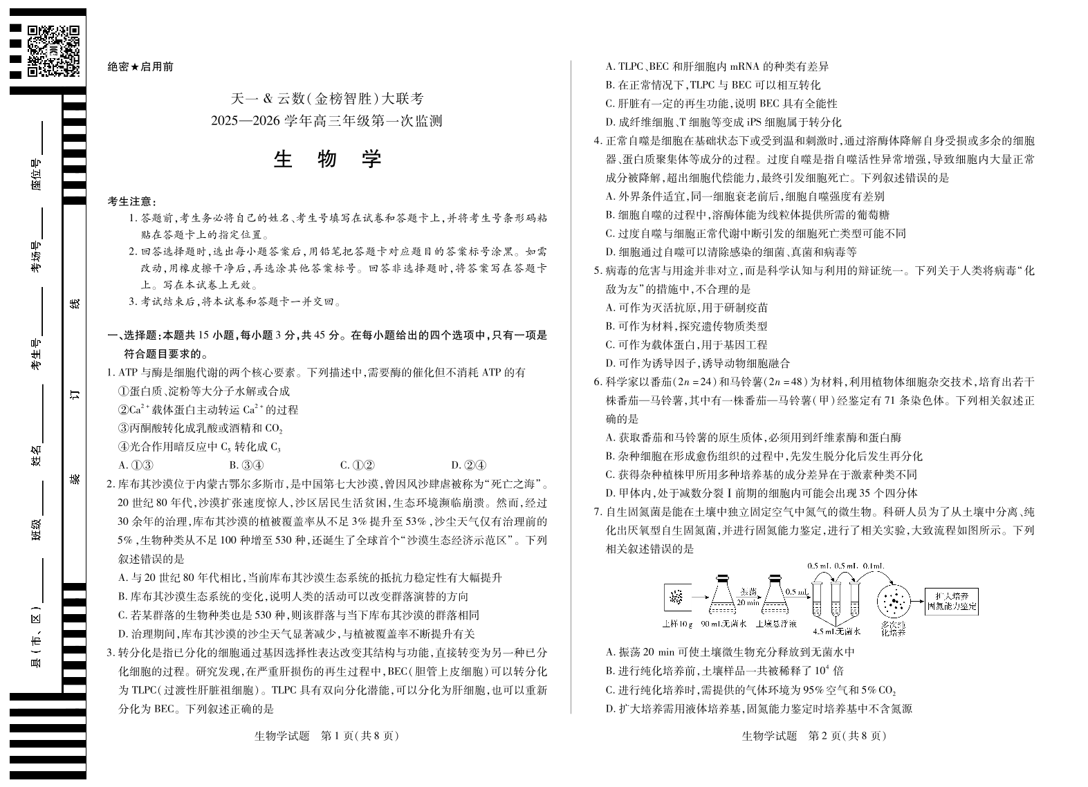 高三生物--四川省天一云数(金榜智胜)大联考2026届高三年级第一次监测