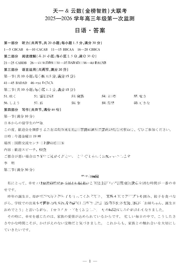 高三日语答案--四川省天一云数(金榜智胜)大联考2026届高三年级第一次监测