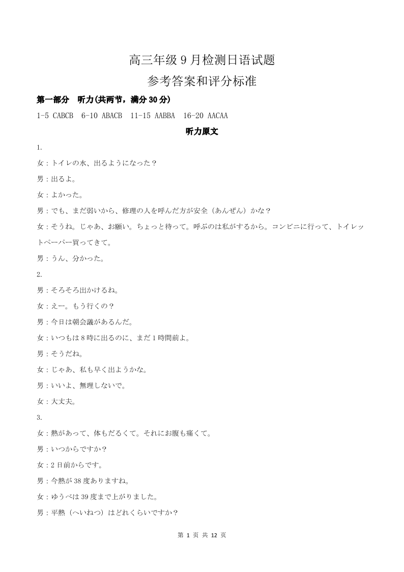 高三日语答案--山东省名校考试联盟2026届高三上学期9月开学摸底考试