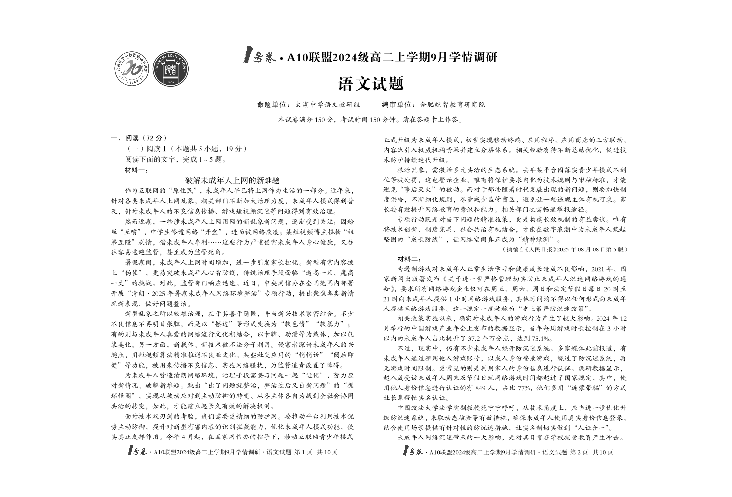 高二语文--安徽省A10联盟2024级高二上学期9月学情调研试题