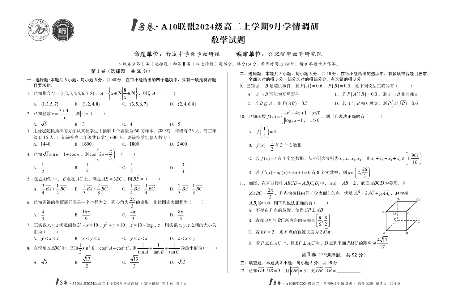 高二数学--安徽省A10联盟2024级高二上学期9月学情调研试题