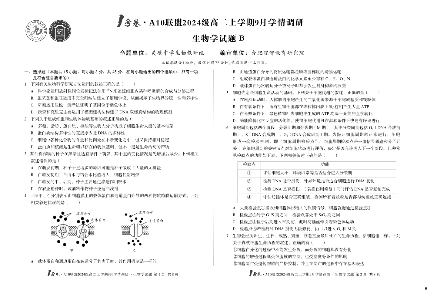 高二生物B--安徽省A10联盟2024级高二上学期9月学情调研试题