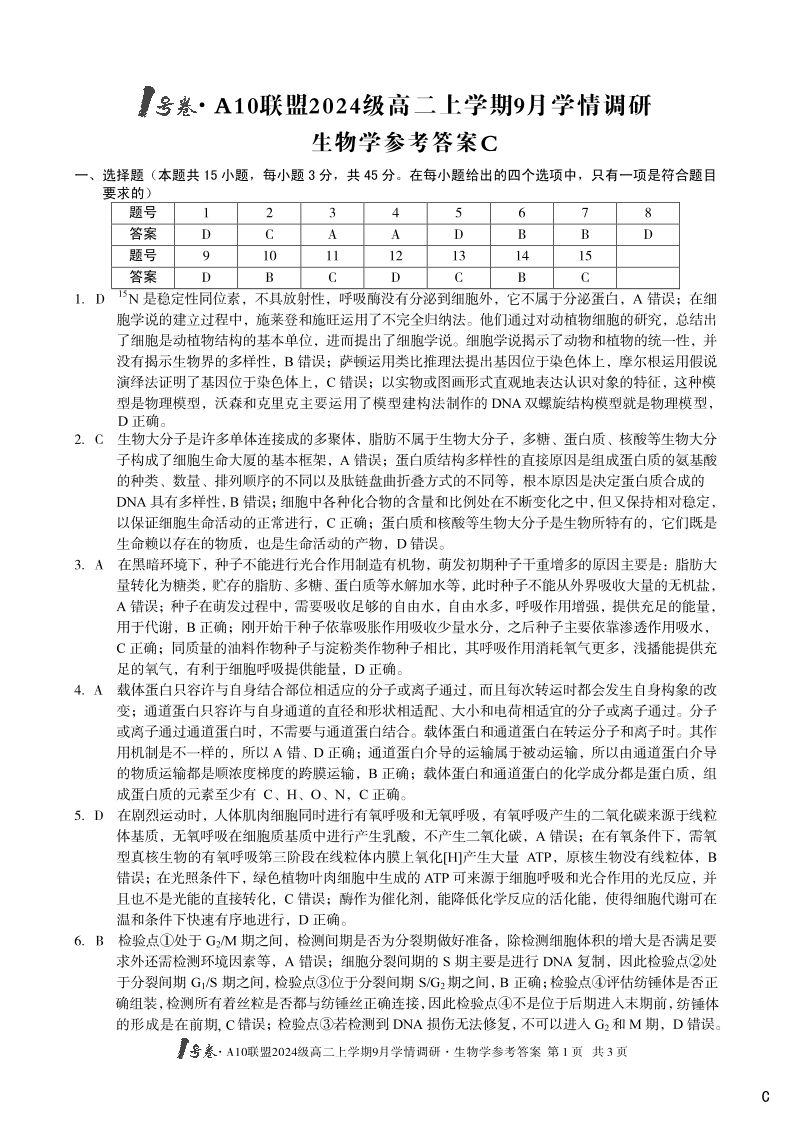 高二生物答案C--安徽省A10联盟2024级高二上学期9月学情调研试题