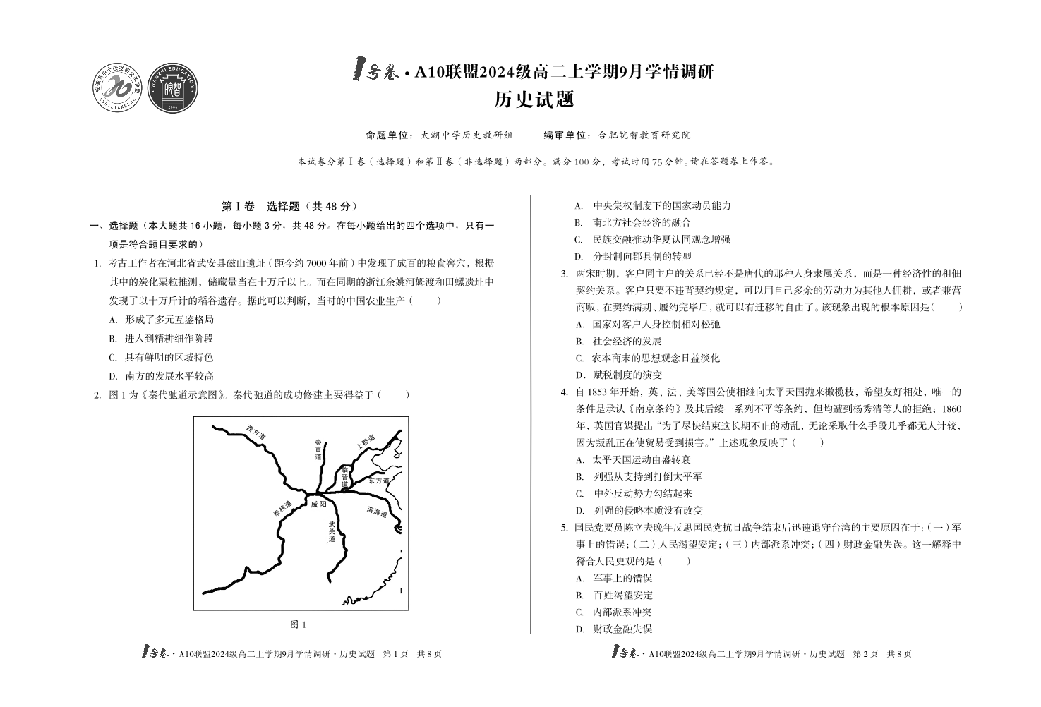 高二历史--安徽省A10联盟2024级高二上学期9月学情调研试题