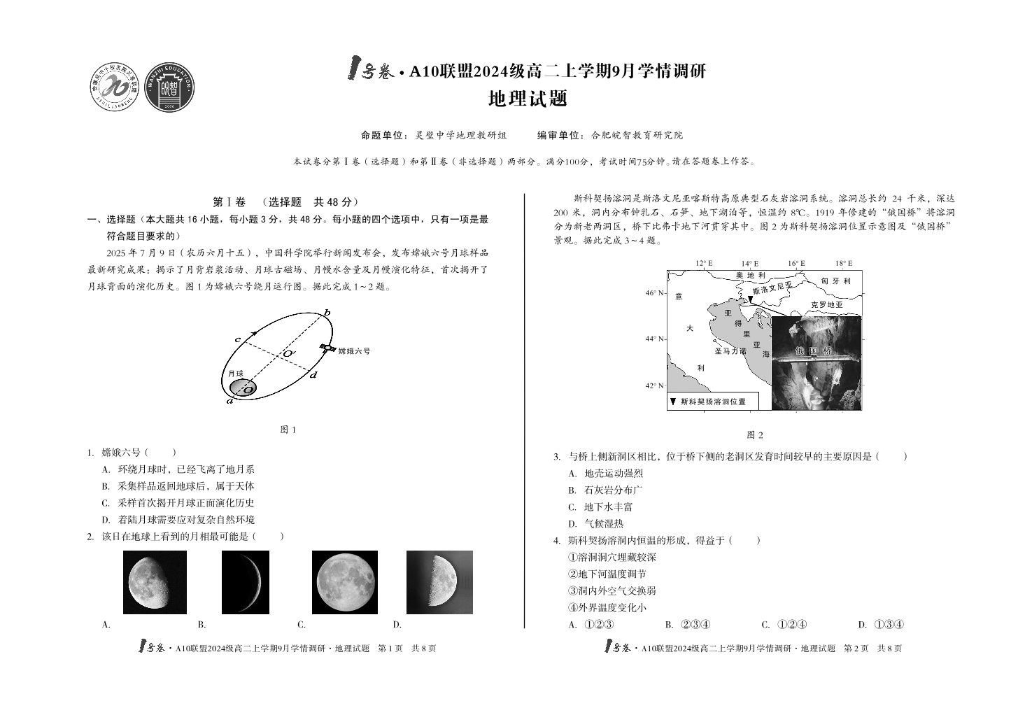 高二地理--安徽省A10联盟2024级高二上学期9月学情调研试题