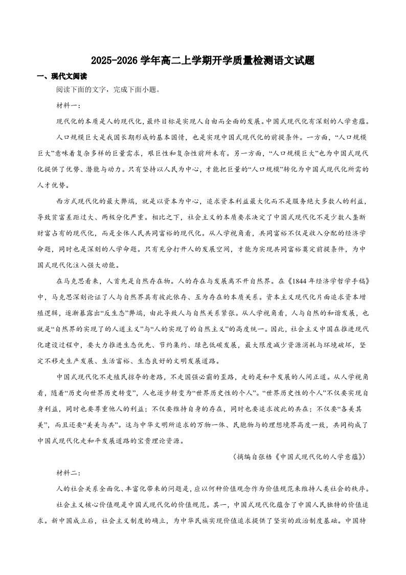 高二语文+答案--广西贵港市平南县中学2025-2026学年高二上学期开学质量检测