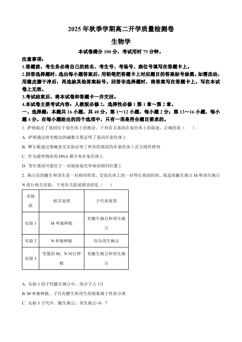 高二生物+答案--广西贵港市平南县中学2025-2026学年高二上学期开学质量检测