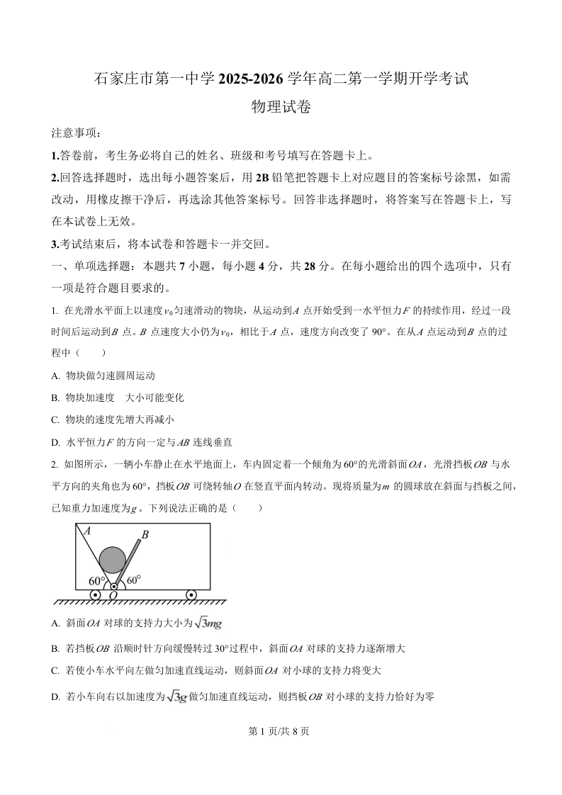 高二物理(原卷版)--河北省石家庄市第一中学2025-2026学年高二上学期开学考试
