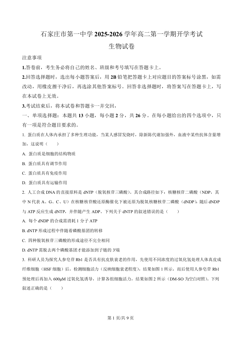高二生物(原卷版)--河北省石家庄市第一中学2025-2026学年高二上学期开学考试