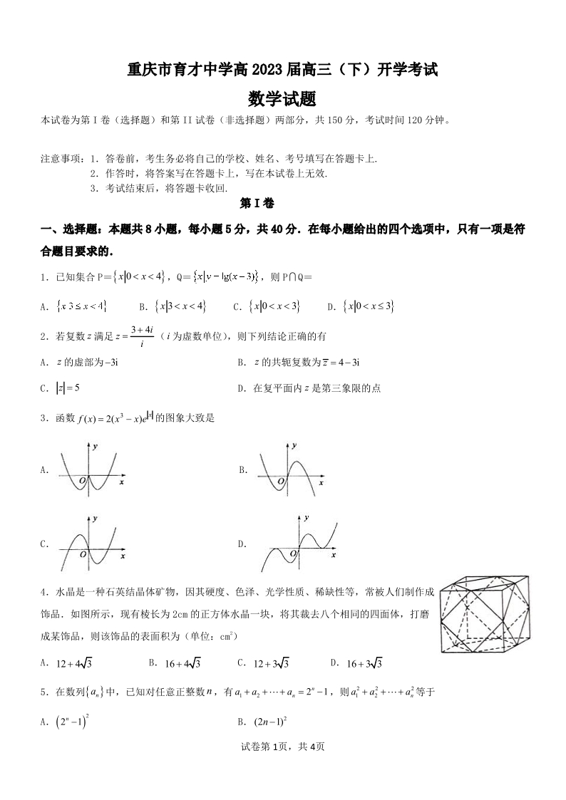 高三数学--重庆市育才中学校2022-2023学年高三下学期开学考试