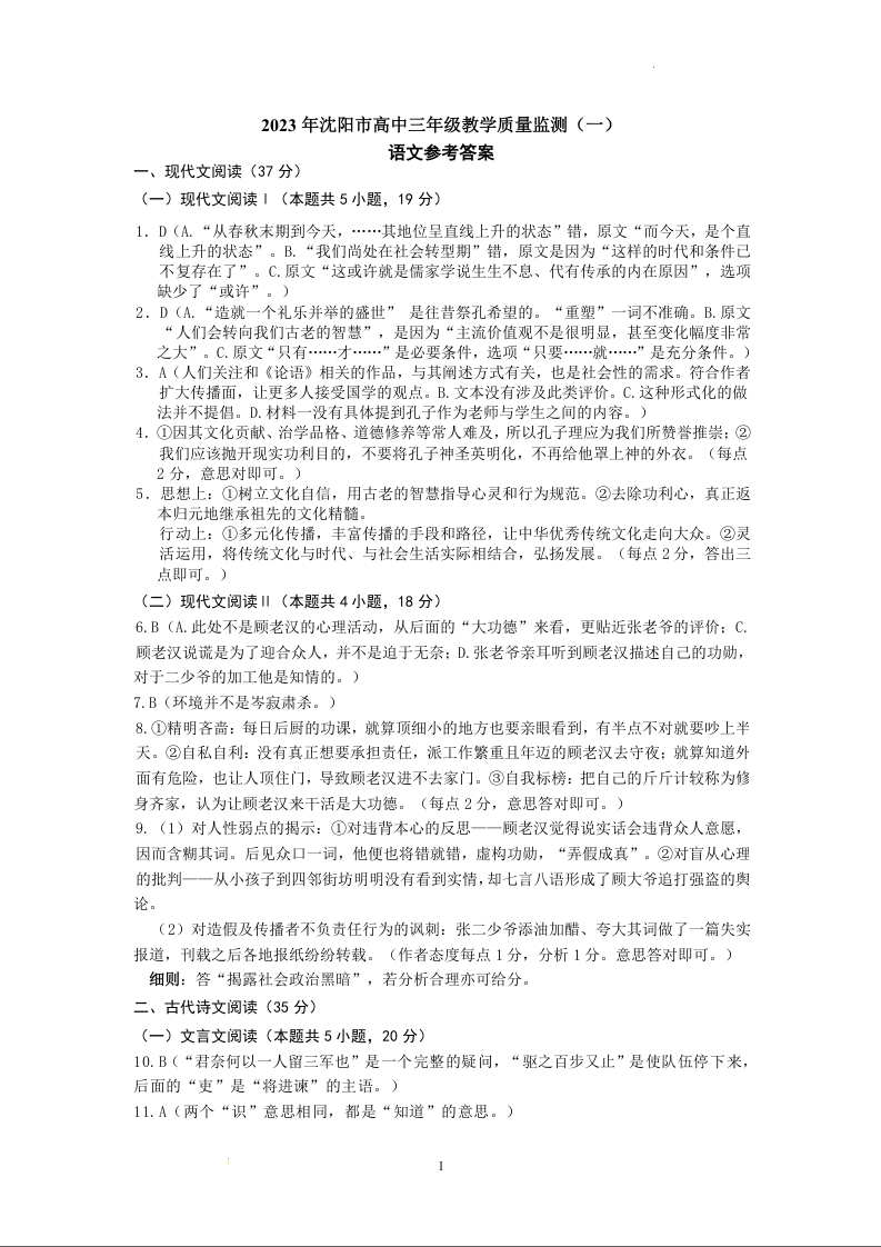 高三语文答案--辽宁省沈阳市2023届高三下学期质量监测(一)