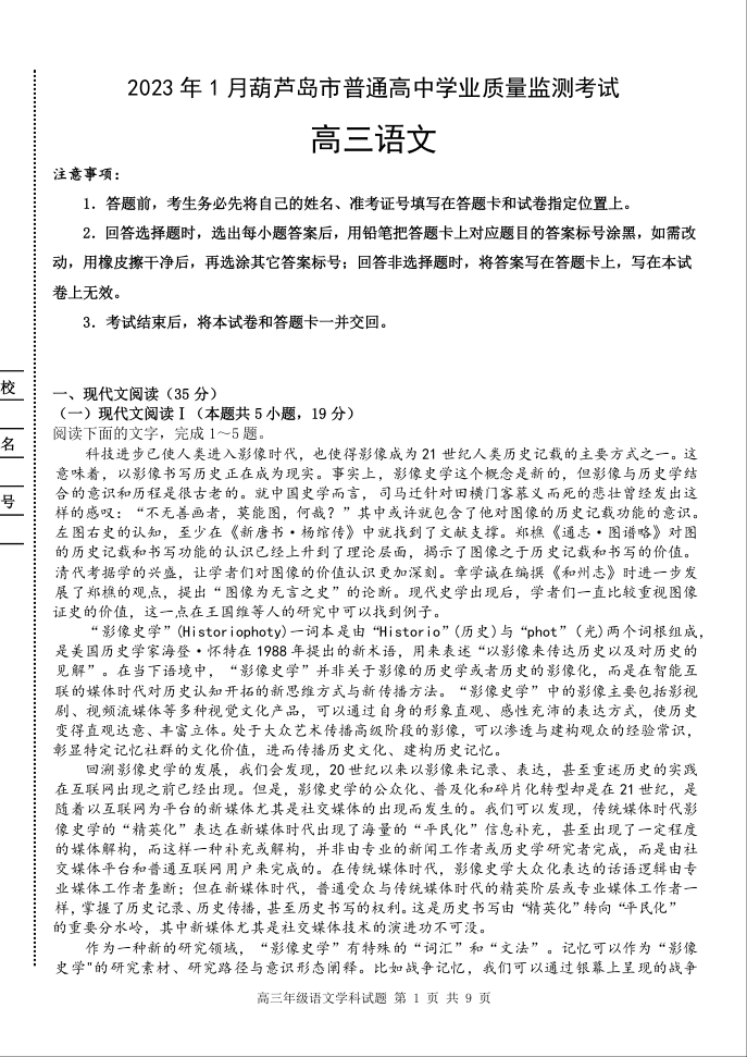 高三语文--辽宁省葫芦岛市2022-2023学年高三上学期期末学业质量监测