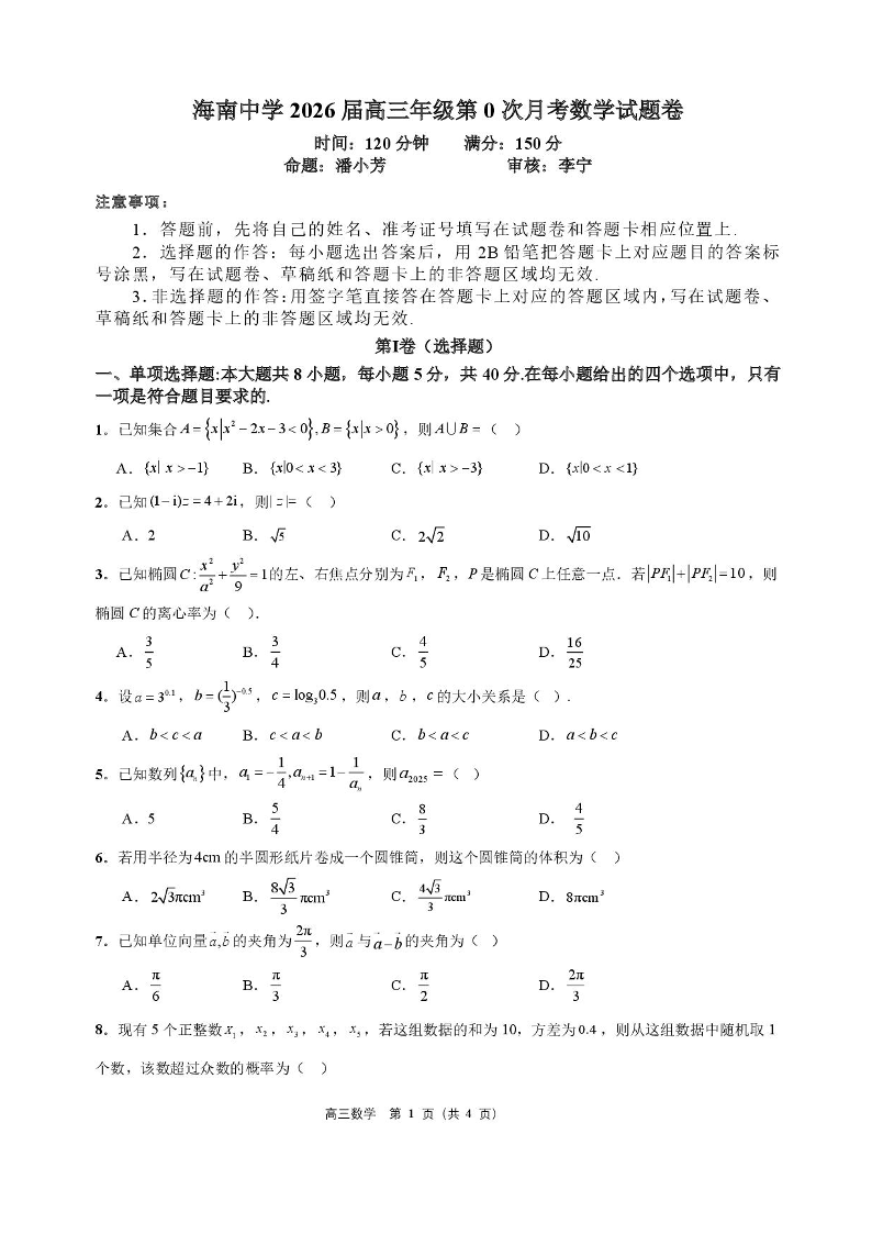 高三数学+答案--海南省海口市海南中学2026届高三上学期9月月考