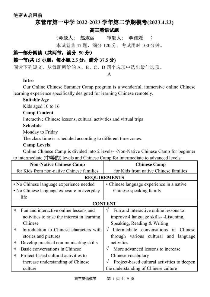 高三英语--山东省东营市第一中学2022-2023学年第二学期模考