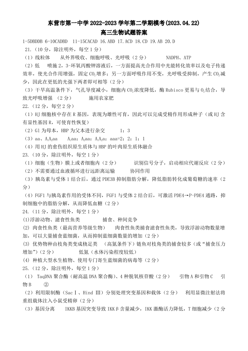 高三生物答案--山东省东营市第一中学2022-2023学年第二学期模考