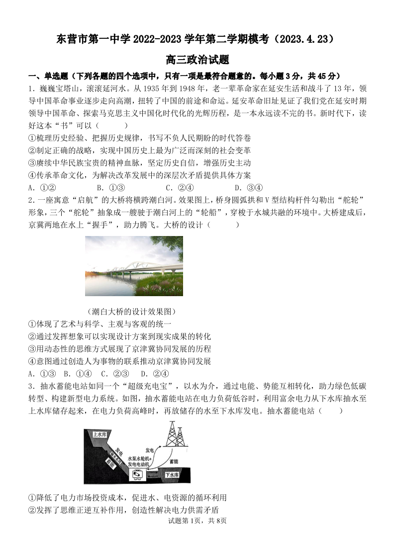 高三政治--山东省东营市第一中学2022-2023学年第二学期模考