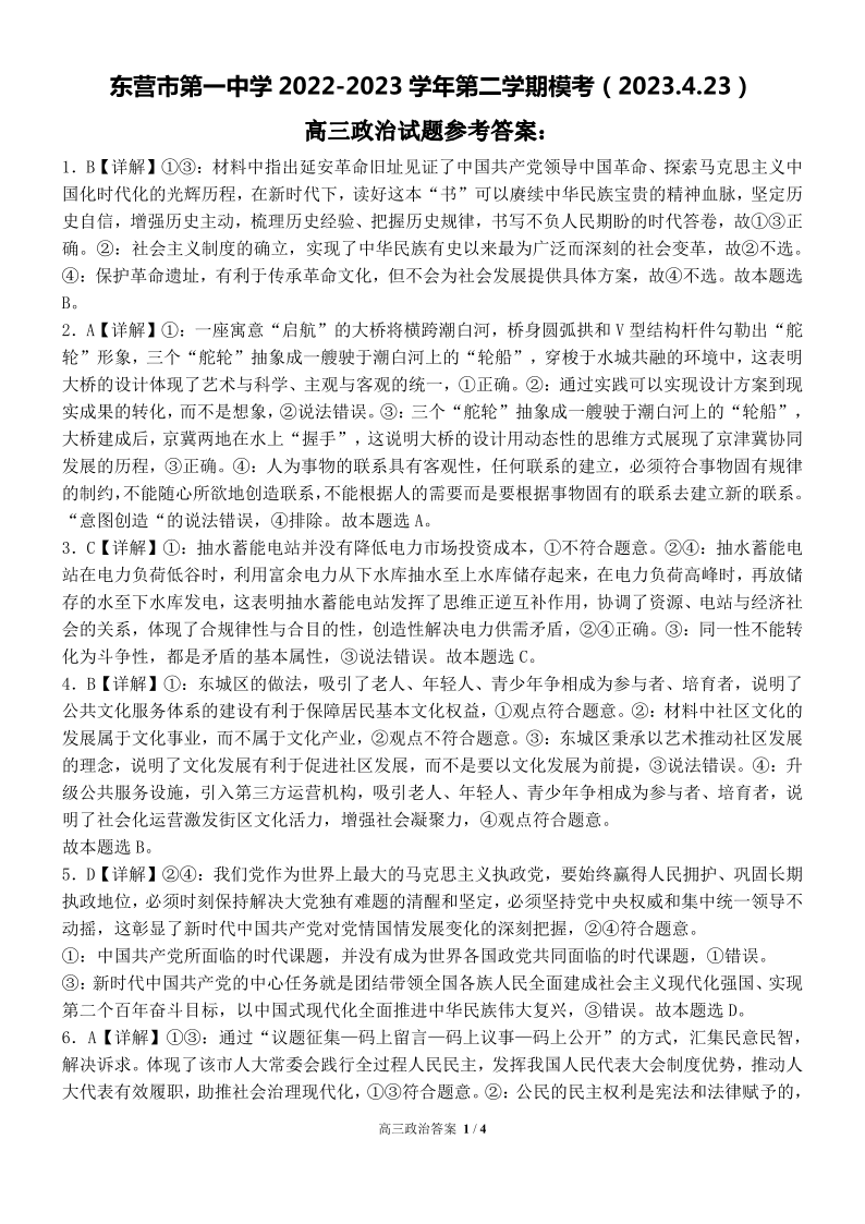 高三政治答案--山东省东营市第一中学2022-2023学年第二学期模考