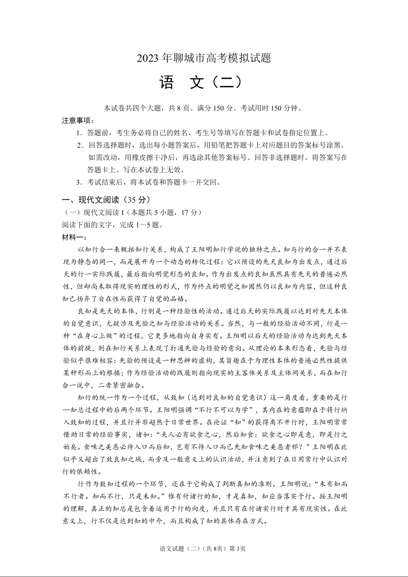 高三语文--山东省聊城市2023高三第二次模拟考试(聊城二模)