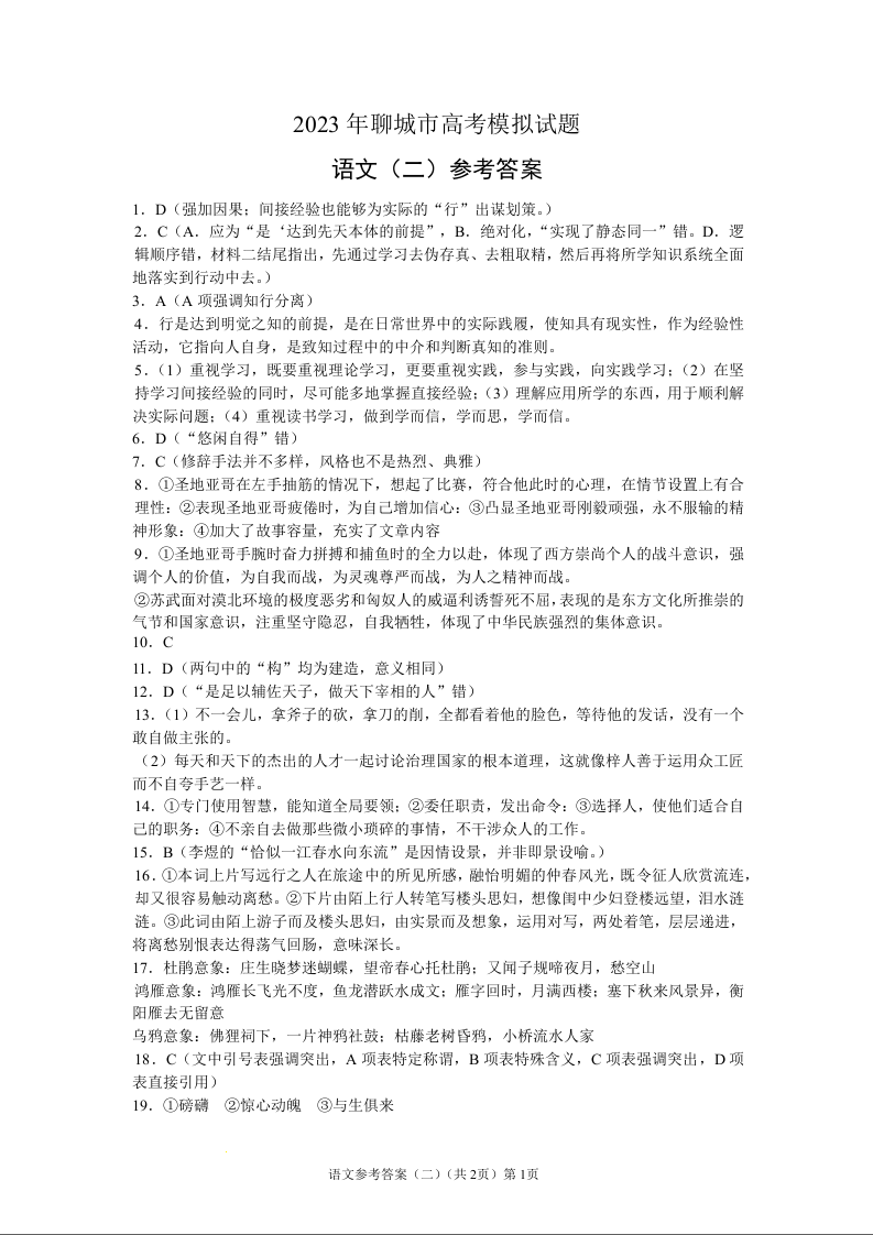 高三语文答案--山东省聊城市2023高三第二次模拟考试(聊城二模)
