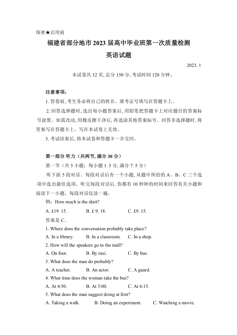 高三英语--福建省七地市2023高中毕业班第一次质量检测