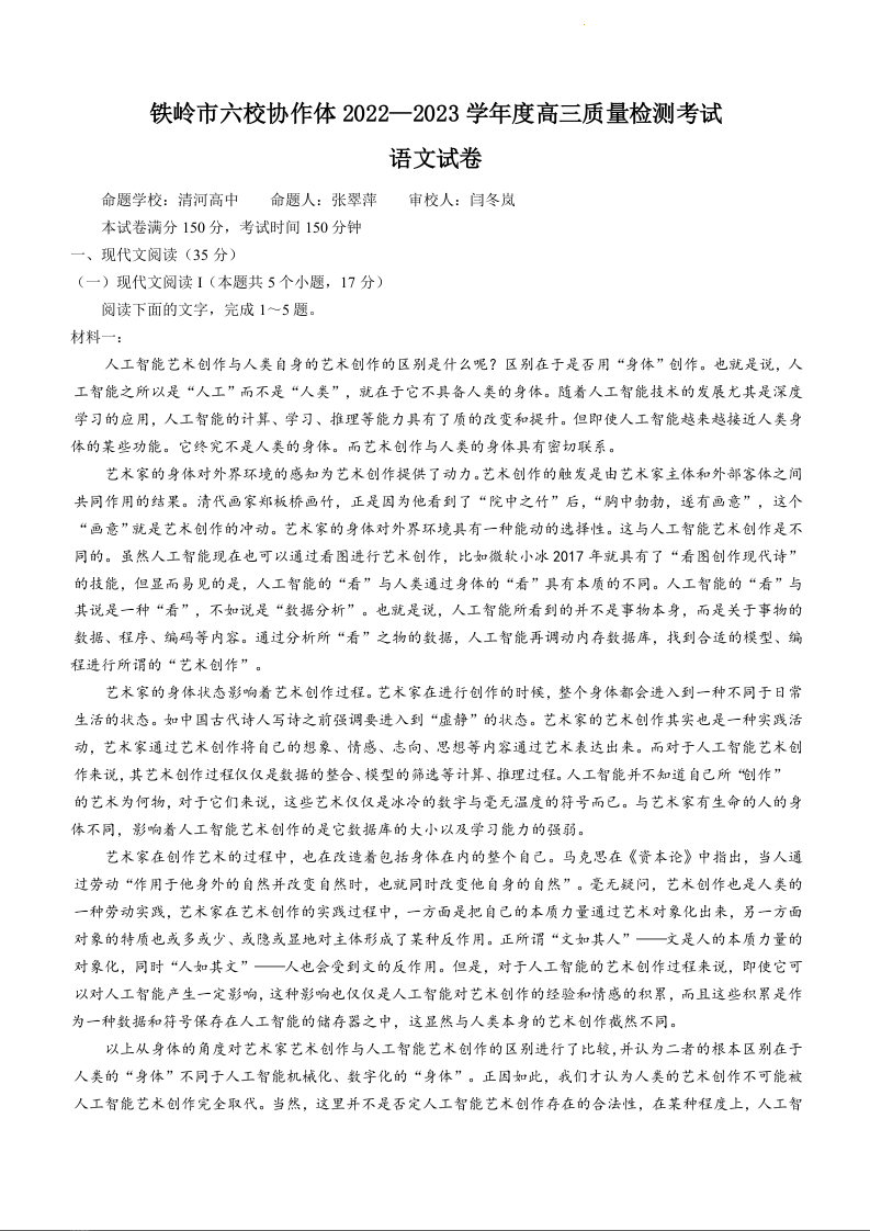 高三语文+答案--辽宁省铁岭市2023六校协作体高三期末质量检测