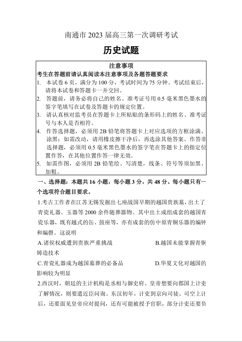 高三历史+答案--江苏省苏北七市2023高三第一次调研测试(南通一模)