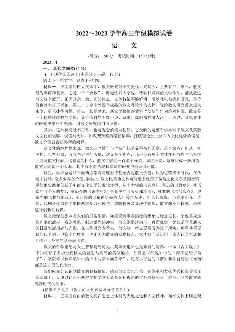 高三语文+答案--江苏省海安市2022-2023学年高三上学期期末考试