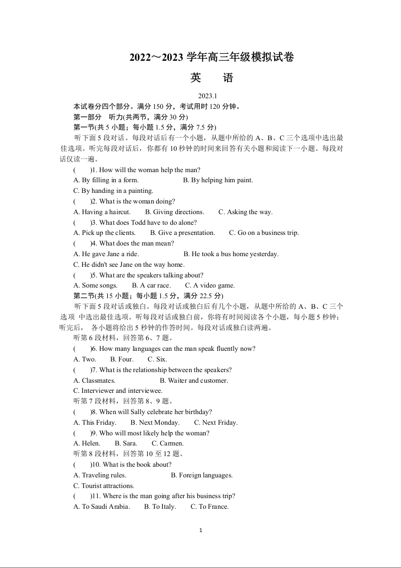 高三英语+答案--江苏省海安市2022-2023学年高三上学期期末考试