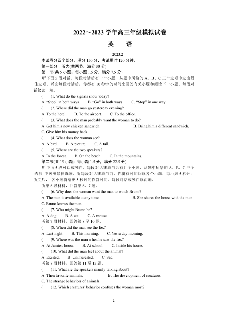 高三英语+答案--江苏省常州市2023高三上学期期末考试(延期)